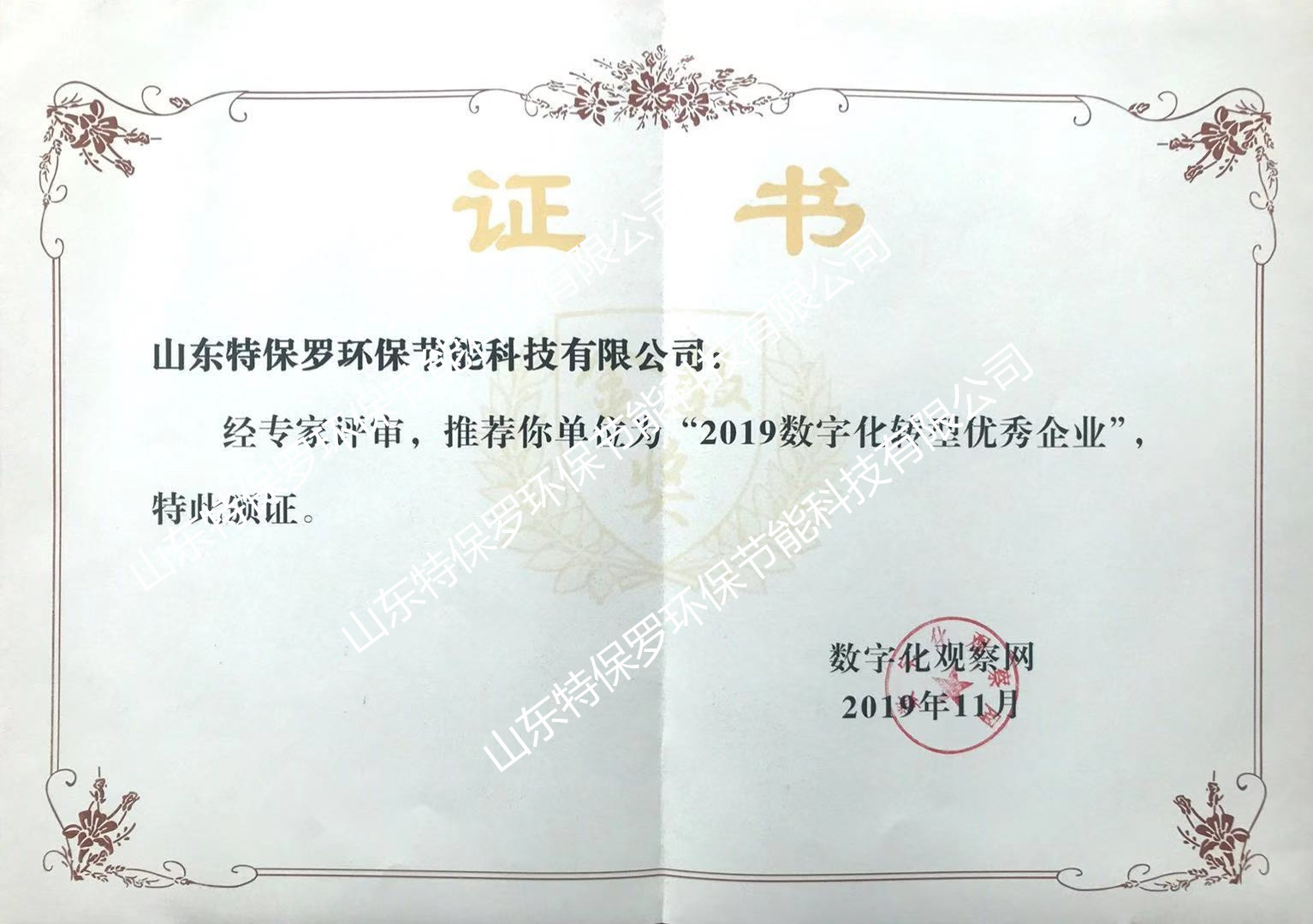 山東特保羅環(huán)保節(jié)能科技有限公司經(jīng)數(shù)字化觀察網(wǎng)專家評審,推薦獲得2019年數(shù)字化轉(zhuǎn)型優(yōu)秀企業(yè)”證書。